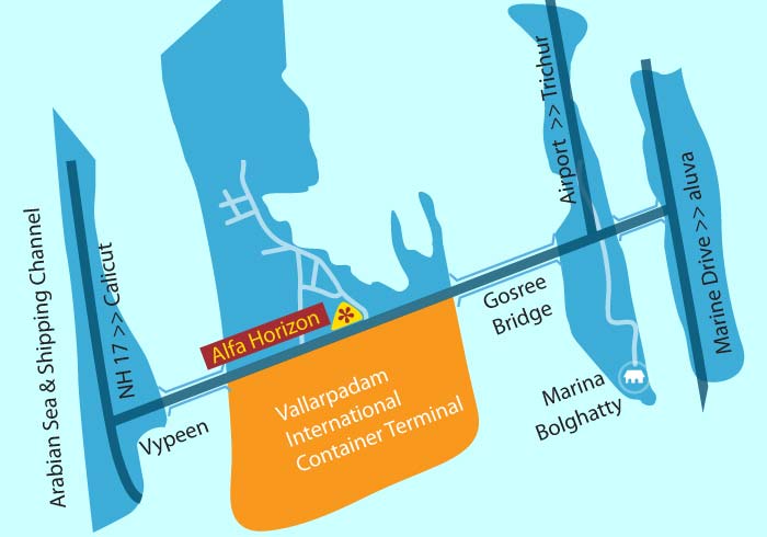 Located at Vallarpadam on the High way connecting Marine Drive and Vaypeen. Right across the proposed Rs. 1,800 crores Vallarpadam International Container Terminal run by Dubai Ports(D.P. World). The port based SEZ(Special Economic Zone) at Vallarpadom is on the Eastern side of the proposed project. The Rs.3,000 crores Petronet L.N.G Project is located in Puthu Vaypeen. Close to Marina,Five star Hotels, Golf course, and Marine Drive. |